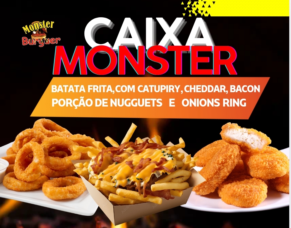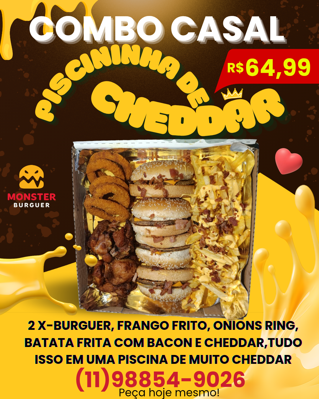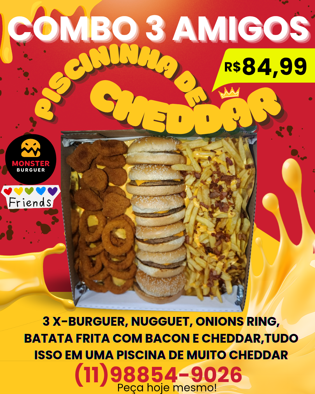 3 X-Burguer, nugguet,onions, batata frita frita com cheddar e bacon, e o melhor, aquela piscina de cheddar na caixa!!