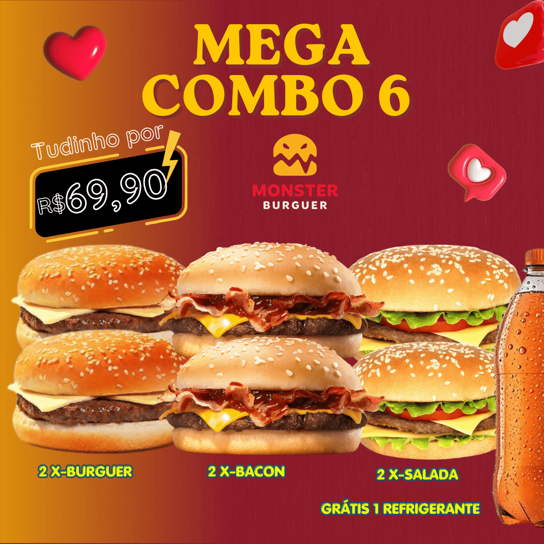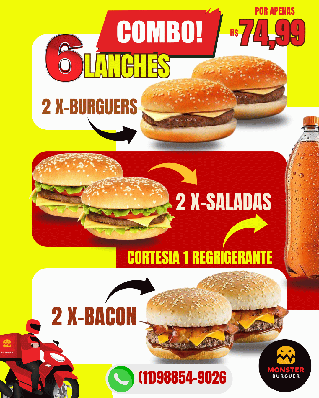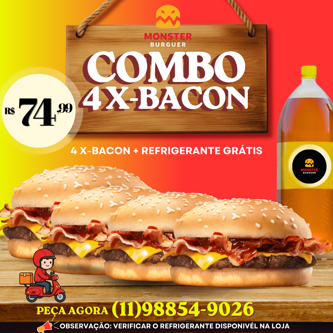 2X-Saladas, 2X-Bacon, 2X-Burguer, Grátis 1 Refrigerante