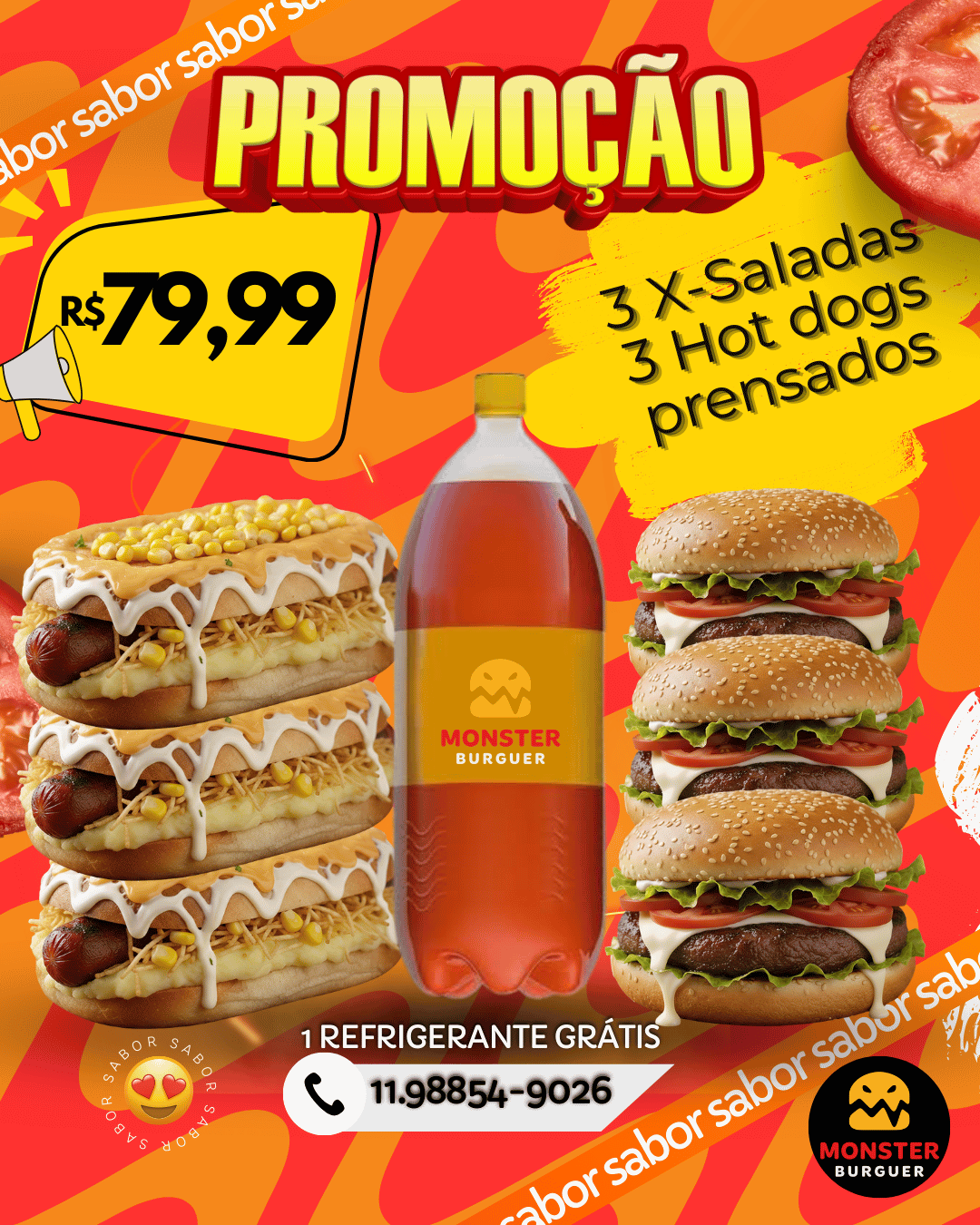 3 x-salada 3 hot dog 1 refrigerante grátis