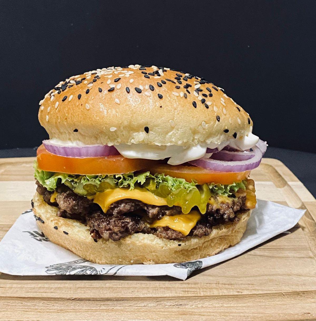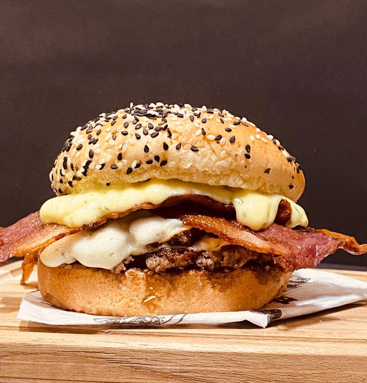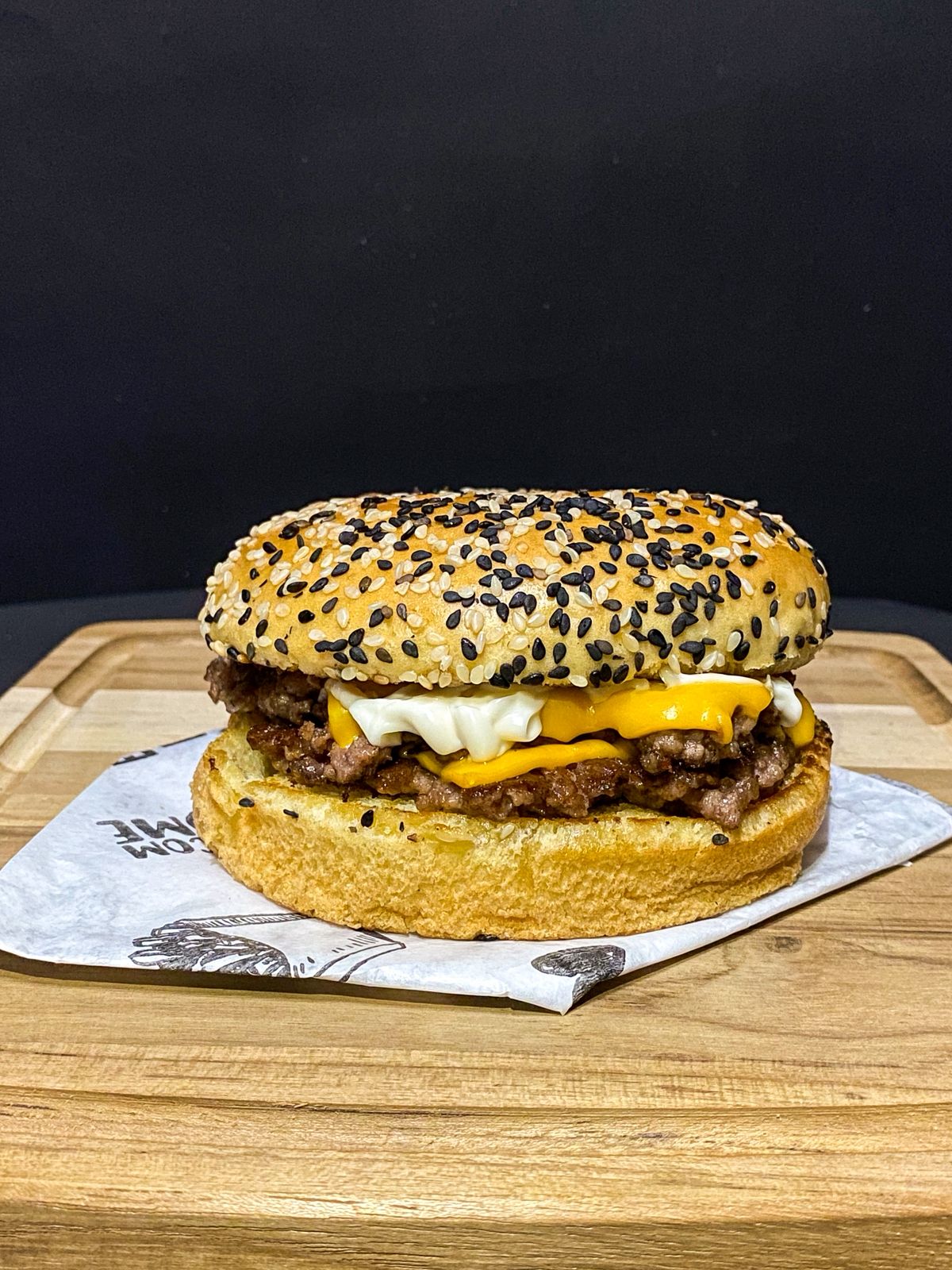 Pão mesclado com gergelim, 2 fatias de provolone, 2 Carnes de 70 gramas cada, Maionese da casa