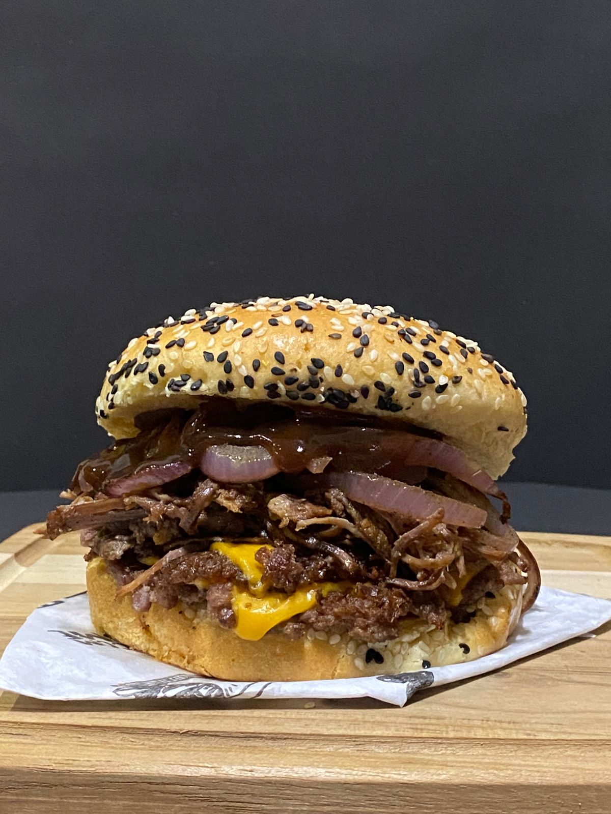 Pão mesclado com gergelim, 2 Carnes 70 gramas cada,Queijo Costela bovina (gaúcha) desfiada, Cebola roxa chapeada, Picles,Molho barbecue.