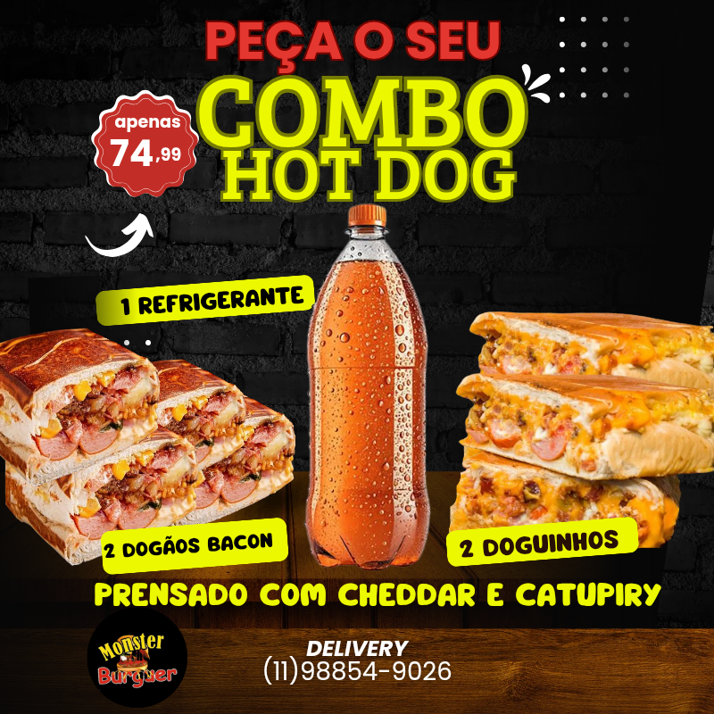 Combo de 2 hot dogs bacon, 2 hot dog Doguinho, mais 1 Refrigerante grátis (Verificar o refrigerante disponivel)